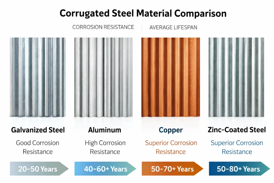 Different types of corrugated steel material with lifespan comparison